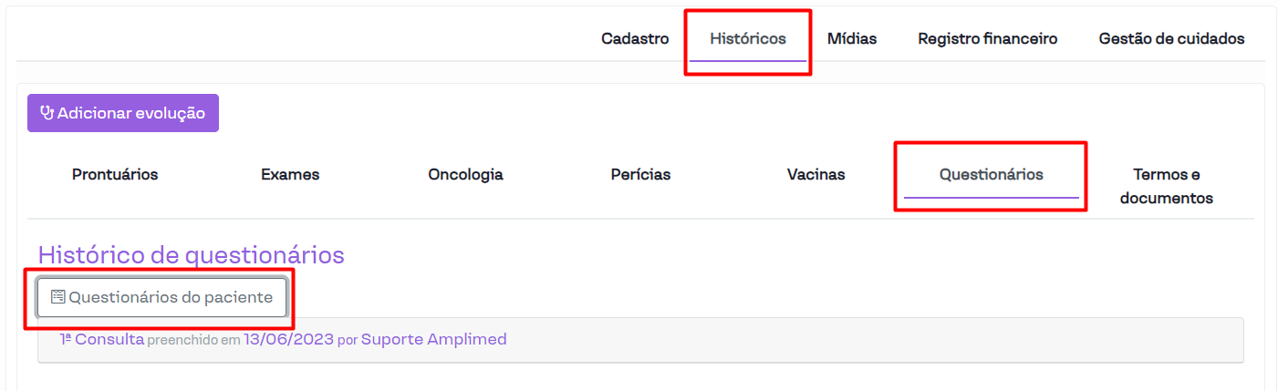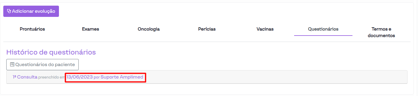 Todos os questionários respondidos pelo paciente estarão salvos em Pacientes > Históricos > Questionários onde será demonstrado quem respondeu e quando foi respondido. Para ter acesso ao histórico de respostas, basta clicar no questionário correspondente a data desejada.