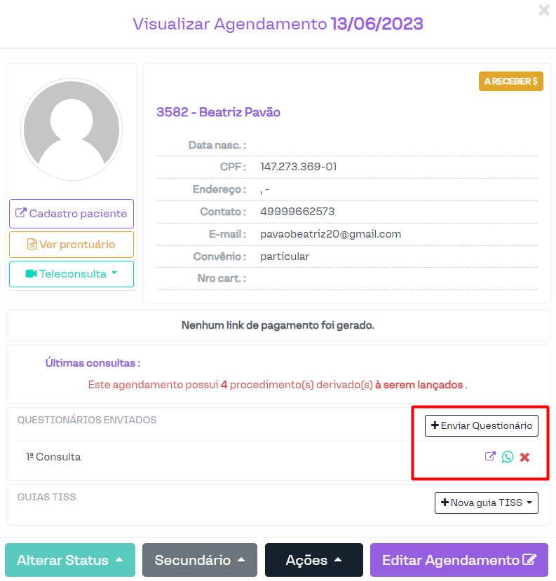 Caso deseje, poderá realizar o envio para o WhatsApp do paciente, acessando o agendamento e clicando no botão correspondente ao WhatsApp: