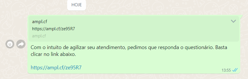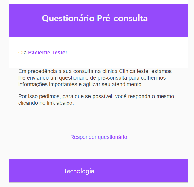 O envio do questionário será realizado juntamente com o envio do aviso de confirmação de consulta no dia anterior ao agendamento, porém em um e-mail/sms separado, exclusivo para o questionário.