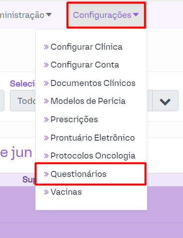 Após isto, para acessar a configuração dos seus questionários, basta seguir até o menu Configurações > Questionários