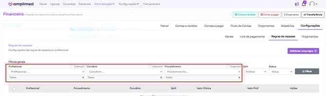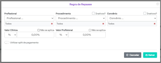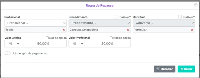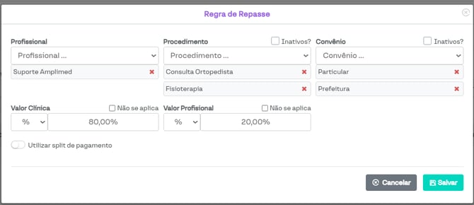 Além disso, é possível escolher se o repasse será em um valor fixo ou em uma porcentagem do valor recebido do paciente.