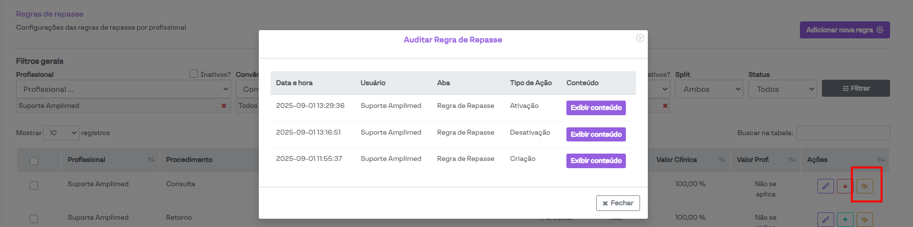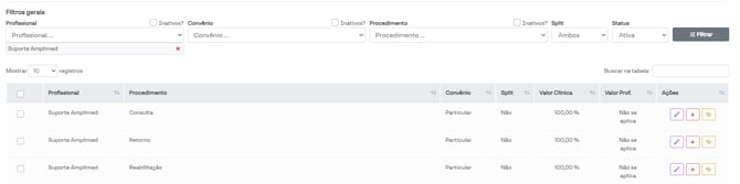 Serão exibidos os repasses já criados, com as informações do profissional, procedimento, convênio e o valor do repasse.