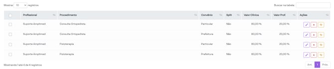 Ao clicar em Salvar, serão criadas quatro regras, uma para cada combinação de procedimento e convênio.