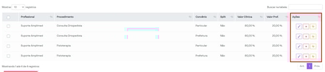 É possível editar, desativar e reativar as regras de repasse utilizando os ícones localizados na coluna Ações, conforme destacado na imagem abaixo.