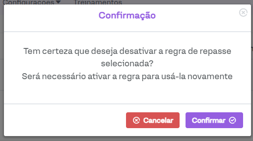 Para desativar a regra de repasse, clique no ícone em forma de uma seta para baixo. Uma mensagem de confirmação será exibida. Para prosseguir com a desativar, basta clicar em Confirmar.