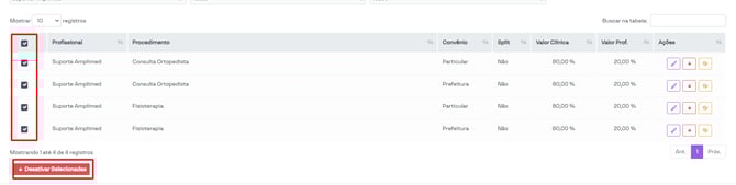 Além disso, é possível desativar várias regras de repasse ao selecionar as regras desejadas e, em seguida, clicar no botão desativar selecionados.
