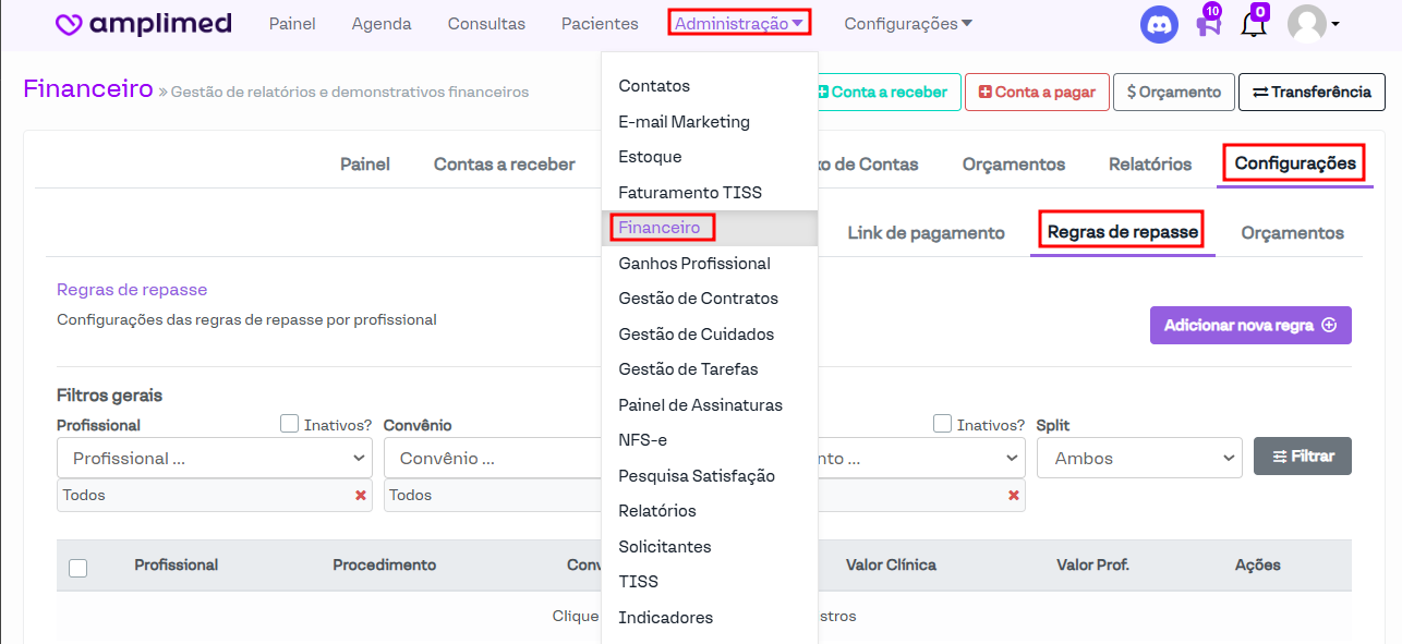 Acesse: Administração > Financeiro > Configurações > Regras de repasse
