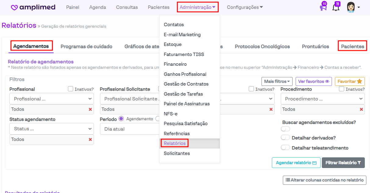 O sistema da Amplimed oferece a possibilidade de gerar diversos relatórios. Os mais requisitados geralmente são os relatórios de agendamentos e de pacientes, que possuem uma estrutura semelhante.