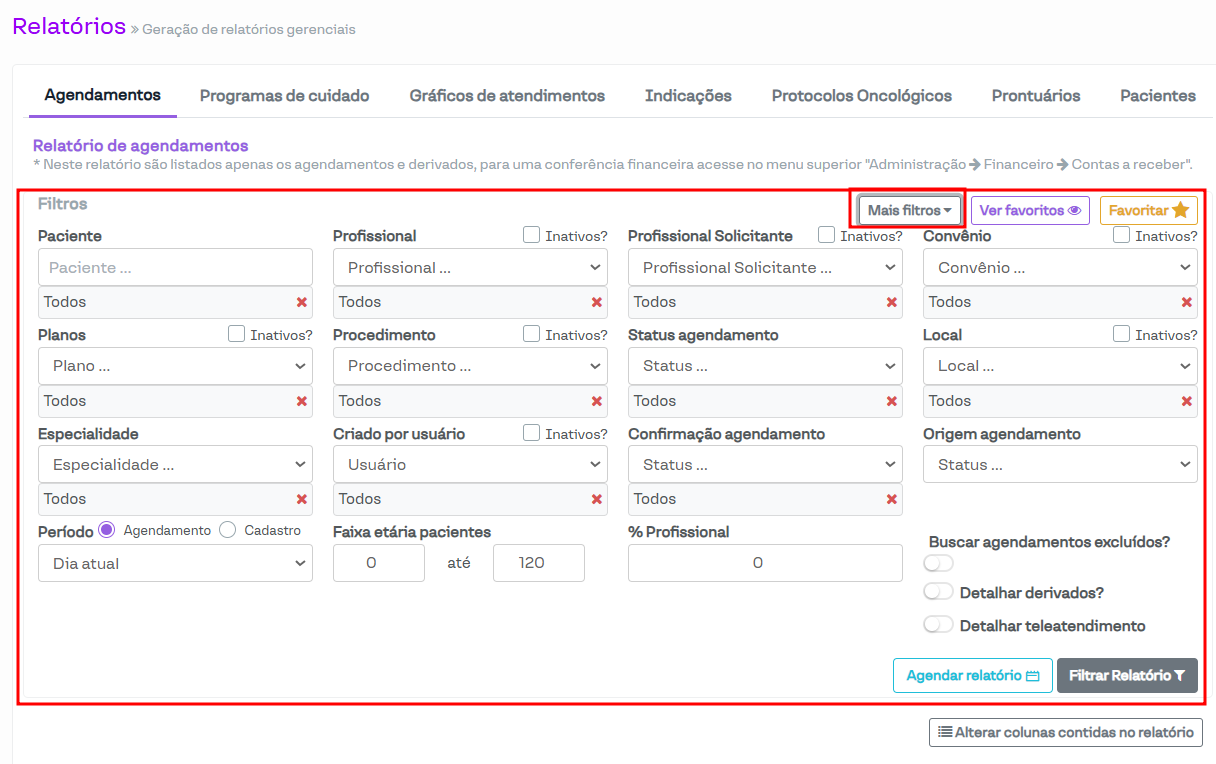 Ao clicar no botão Mais filtros, é possível visualizar todos os filtros que podem ser utilizados ao gerar o relatório de agendamentos. Vamos detalhá-los a seguir.