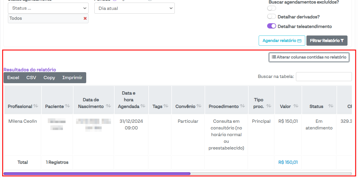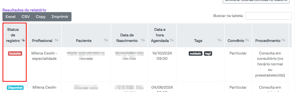 Ao selecionar essa opção, é possível visualizar no relatório os agendamentos que foram excluídos previamente. Esses agendamentos serão apresentados no relatório com o status Excluído, conforme ilustrado na imagem a seguir.