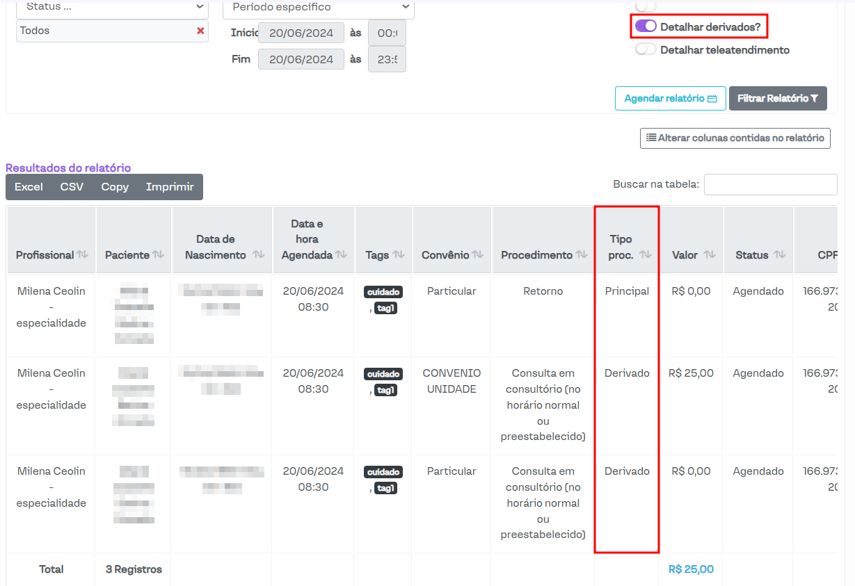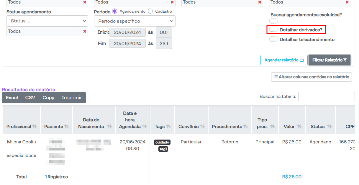 Permite visualizar os procedimentos derivados dos agendamentos. A imagem abaixo mostra um relatório de agendamentos gerado sem essa opção ativada.