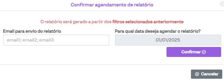 Após preencher as informações desejadas, basta clicar em Confirmar, e o sistema gerará o relatório de acordo com os filtros selecionados, enviando-o para o e-mail informado.