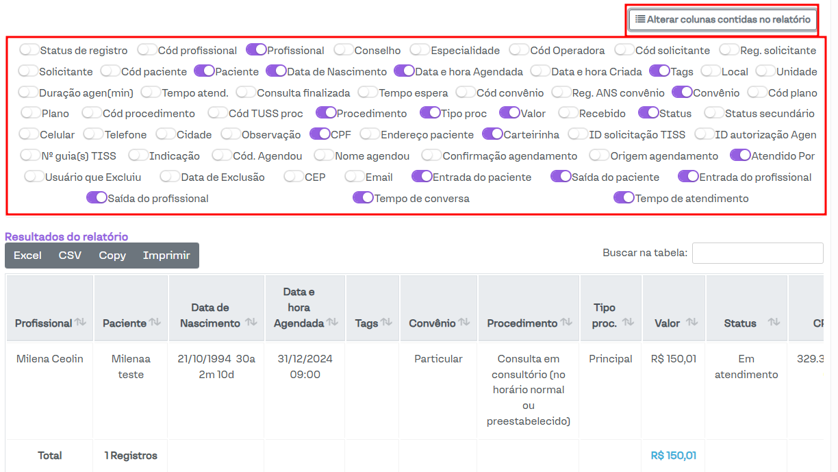 É possível ajustar a visualização das informações conforme desejado, clicando no botão Alterar colunas contidas no relatório.