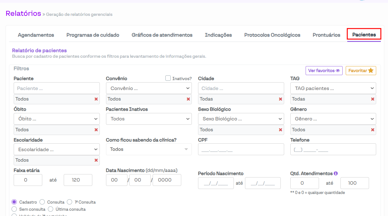Vale destacar que não serão apresentados pacientes para os quais o respectivo campo não foi preenchido. Por exemplo, se um cadastro de paciente não tiver o campo Sexo Biológico preenchido, ele não será retornado no relatório de pacientes femininos ou masculinos.