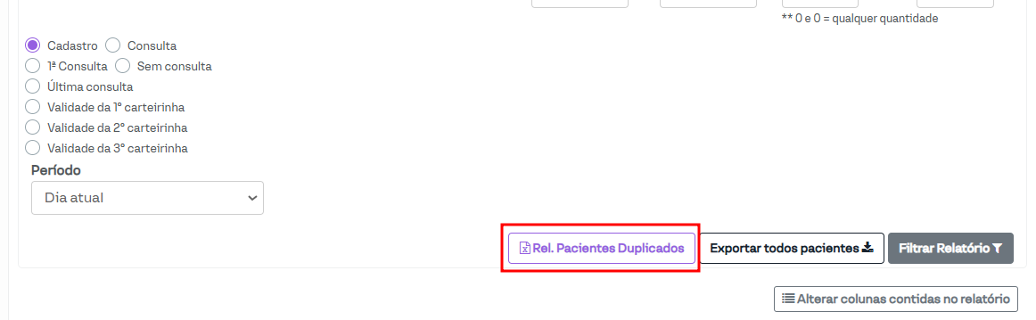 Além de gerar o relatório de pacientes, é possível realizar o download do relatório de pacientes duplicados clicando no botão Rel. Pacientes Duplicados, conforme destacado na imagem a seguir.