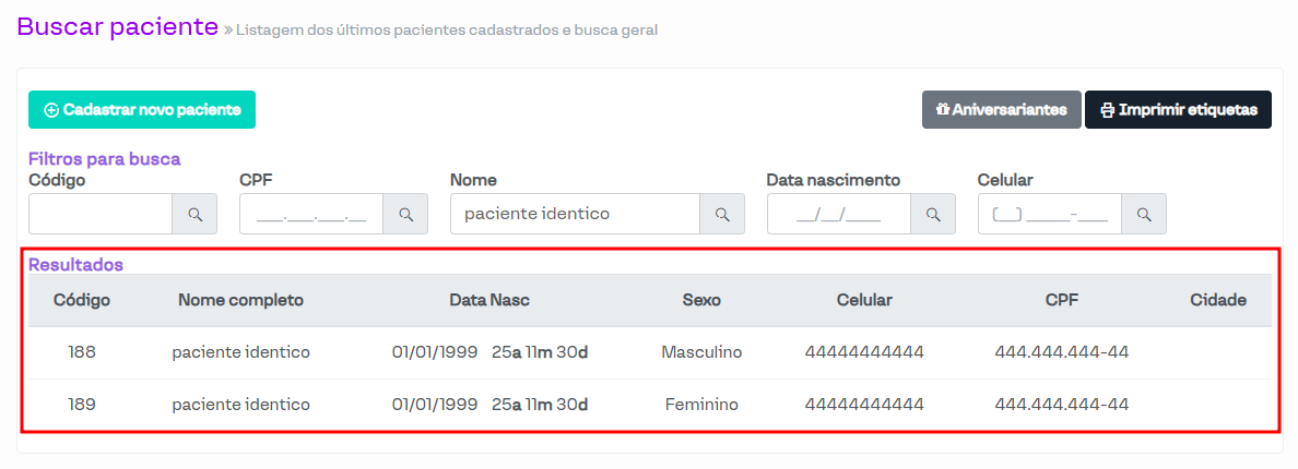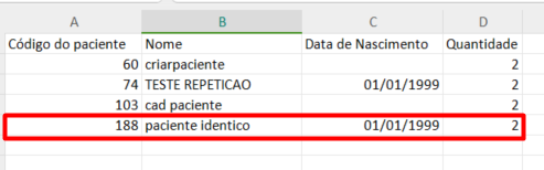 Nesse relatório, o sistema identifica pacientes com o nome e a data de nascimento idênticos. Caso o paciente não possua a data de nascimento cadastrada, o sistema levará em consideração apenas o nome, como é possível observar no relatório gerado.