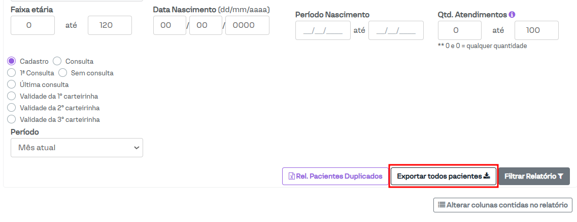 O sistema também permite exportar todos os pacientes cadastrados. Para isso, basta clicar no botão Exportar Todos os Pacientes, conforme destacado na imagem a seguir.