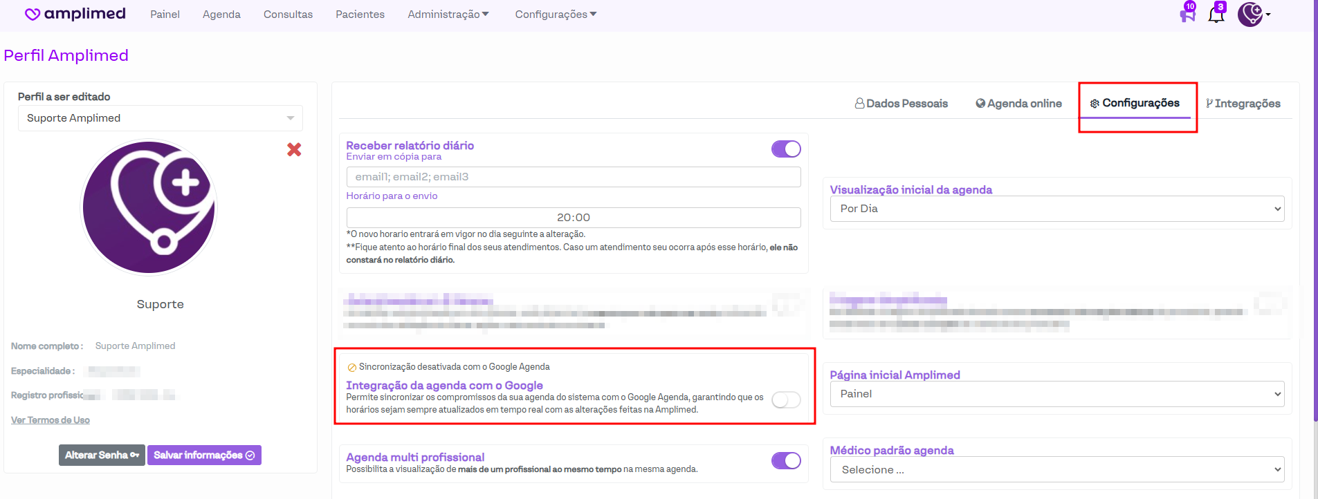 Clique na aba de Configurações e encontre o botão de Integração da agenda com o Google e ative: