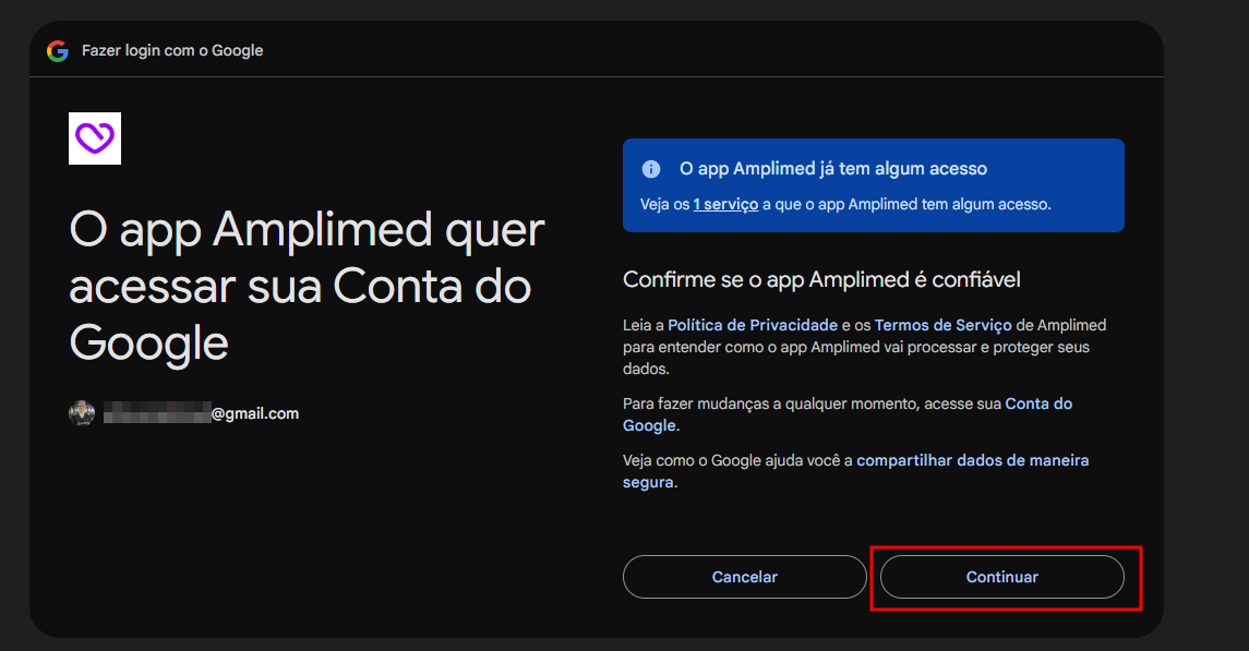 Poderá ter os Termos de Serviços, Privacidade e Segurança e clique para Continuar: