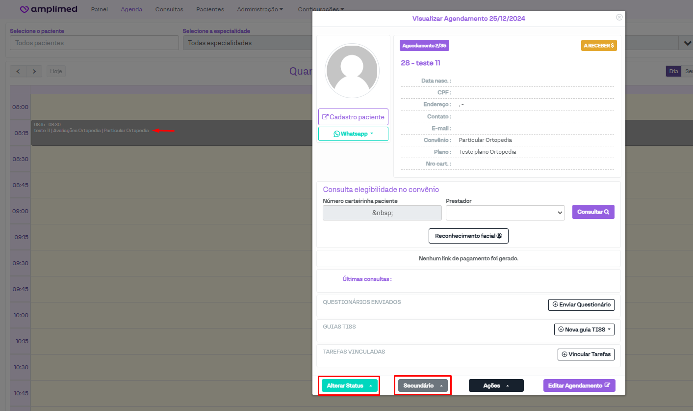 Para alterar o status ou o status secundário de um agendamento cadastrado, será preciso encontrar e depois clicar sobre ele. Na nova janela, haverão duas opções na parte inferior: a "Alterar Status" e o "Secundário".