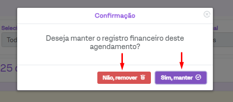 No caso dos status reagendado, cancelado e não compareceu, ao selecionar algum deles será apresentada uma mensagem em sua tela. Nela será preciso optar por manter o registro financeiro do agendamento (clicar no botão "sim, manter") ou em excluir (clicar no botão "não, remover"), conforme a necessidade.