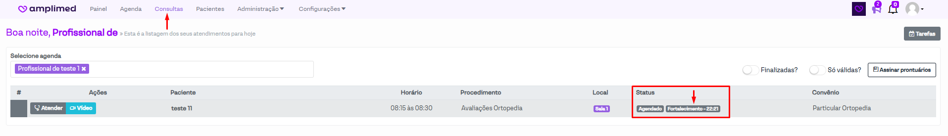Na aba "Consulta", tanto o status padrão como o status secundário são exibidos ao profissional. Assim, isso pode auxiliá-lo na condução da consulta com a informação do status secundário.