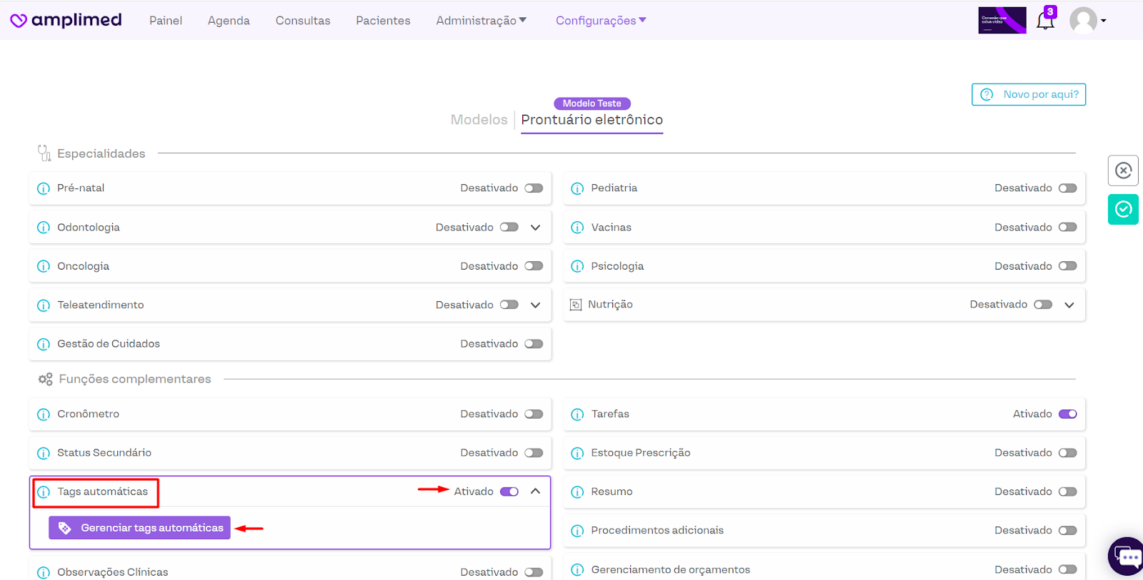 Dentro das configurações do prontuário eletrônico, terá o campo “Tags automáticas”. Caso estiver desativado, basta habilitar e posteriormente clicar em “Gerenciar tags automáticas”: