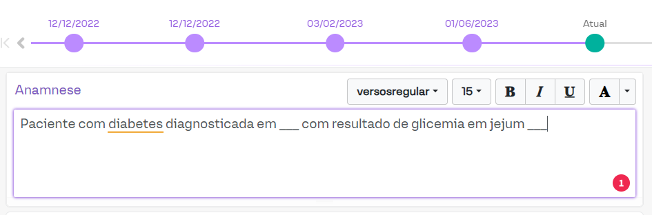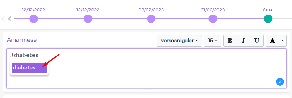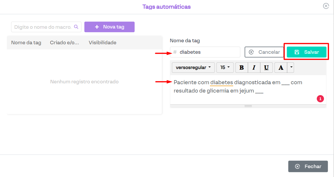 Após salvar todas as alterações realizadas no modelo do prontuário eletrônico, a tag automática estará pronta para ser utilizada no atendimento. Para encontrá-la, digite “#” e as iniciais do nome da tag cadastrada.