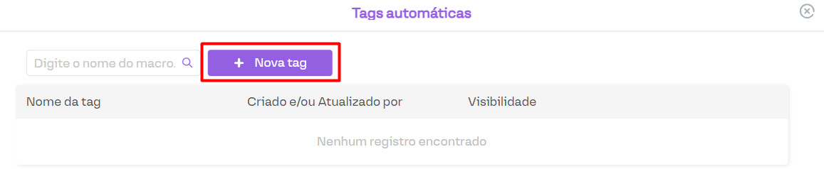 Após clicar em gerenciar, irá abrir a seguinte tela, na qual é possível ver as tags já cadastradas e também criar, em “+ Nova tag”: