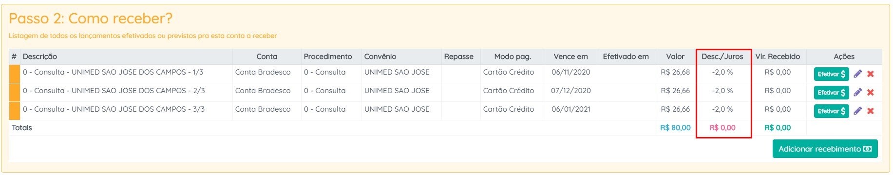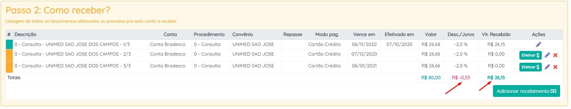 Note que agora as parcelas possuem suas taxas de desconto, porém sem o valor total já discriminado, pois as parcelas ainda não foram efetivadas: