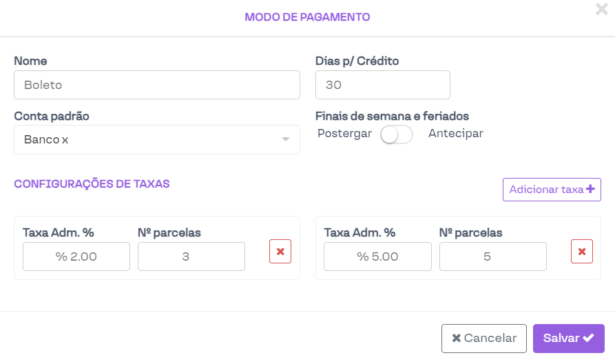 Sabemos que fazer o controle manual de taxas de cartão de crédito é um trabalho cansativo e longo. Para acabar de vez com isto, agora é possível cadastrar taxas com suas respectivas datas de cobrança para qualquer modo de pagamento.