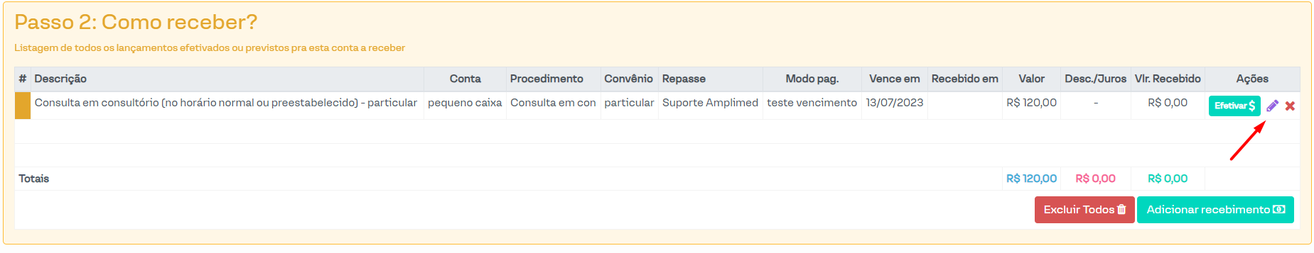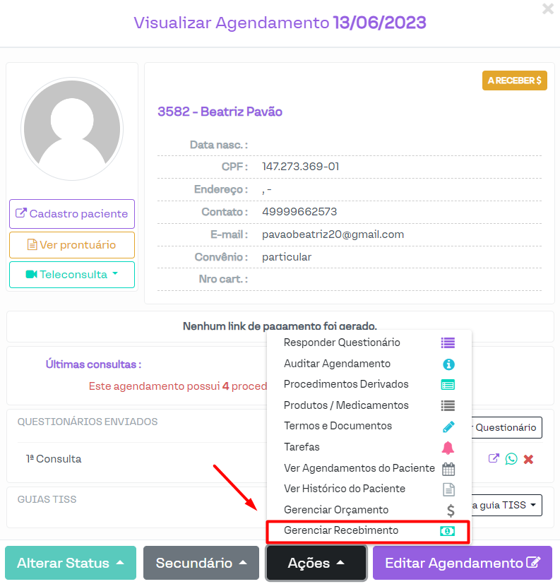Pelo agendamento do paciente, basta abrir a sua agenda, encontrar o paciente e ir em ações -> gerenciar recebimento: