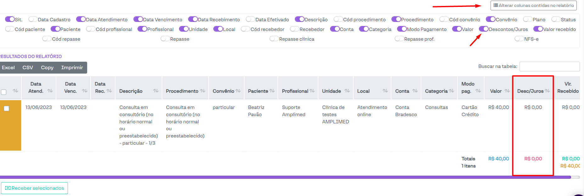 Buscando pela data de vencimento das parcelas, nome do paciente e ativando a coluna de descontos/juros.