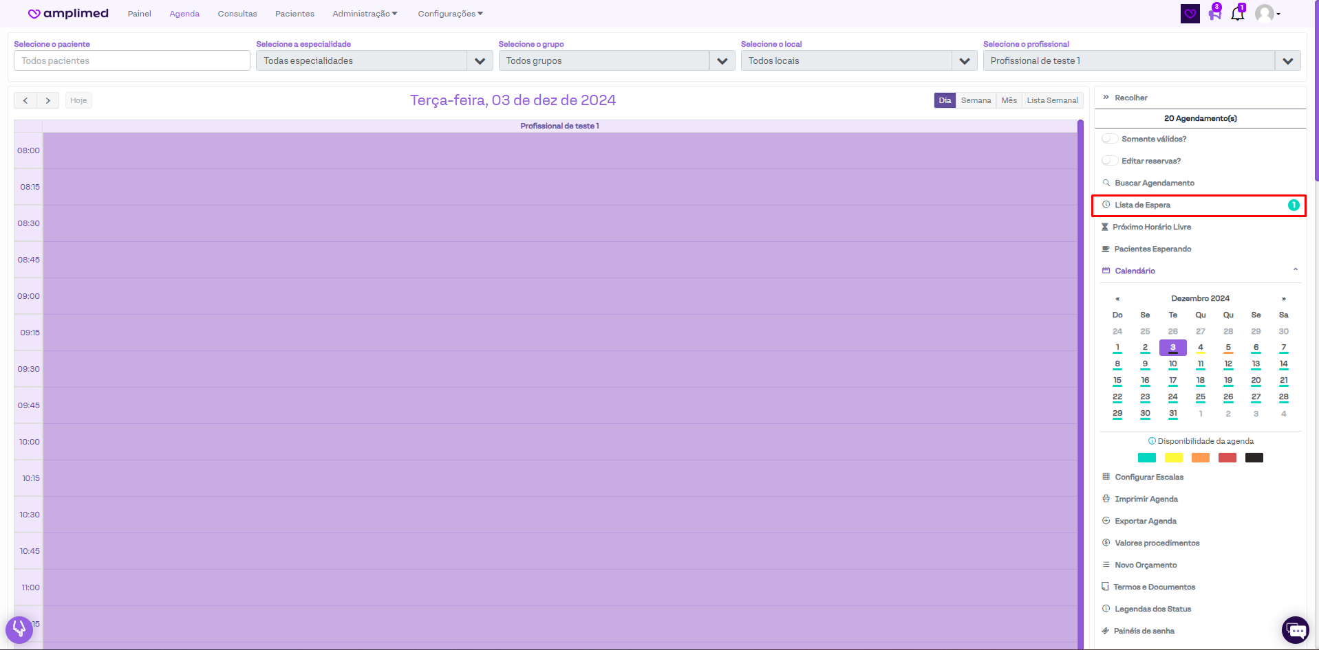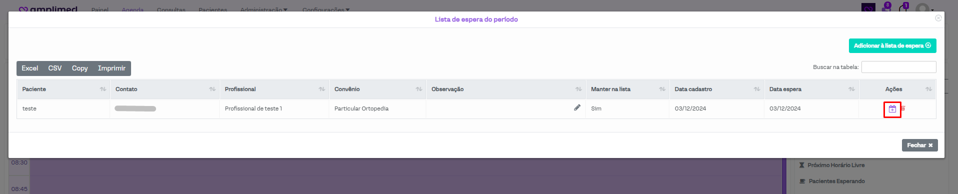 Para inserir os agendamentos da lista de espera para a agenda de um profissional, basta abrir a lista de espera e no agendamento desejado, clicar no ícone da agenda em roxo.