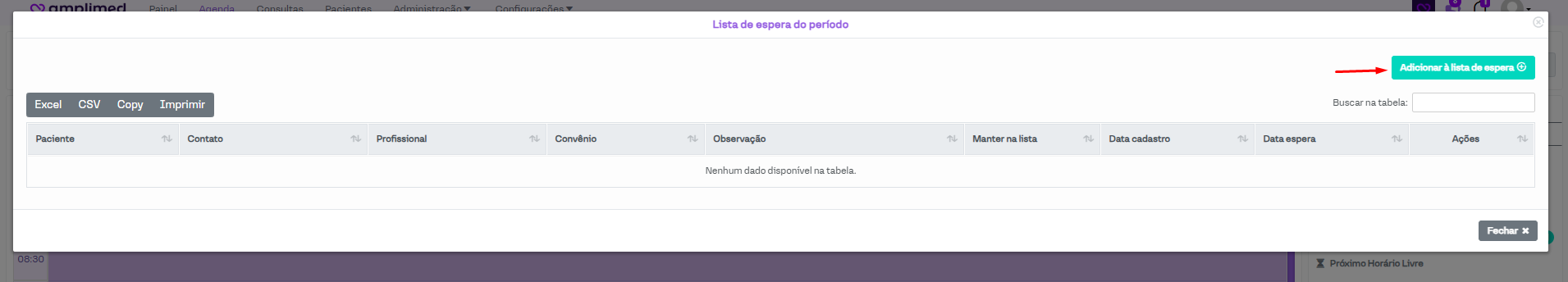 A lista de espera é uma ferramenta que permite salvar um agendamento para que ele possa ser adicionada a agenda mais tarde. Como sua principal finalidade, ele é utilizado para o que agendamento incluído na lista de espera seja passado para a agenda do profissional desejado assim que houver um horário disponível.