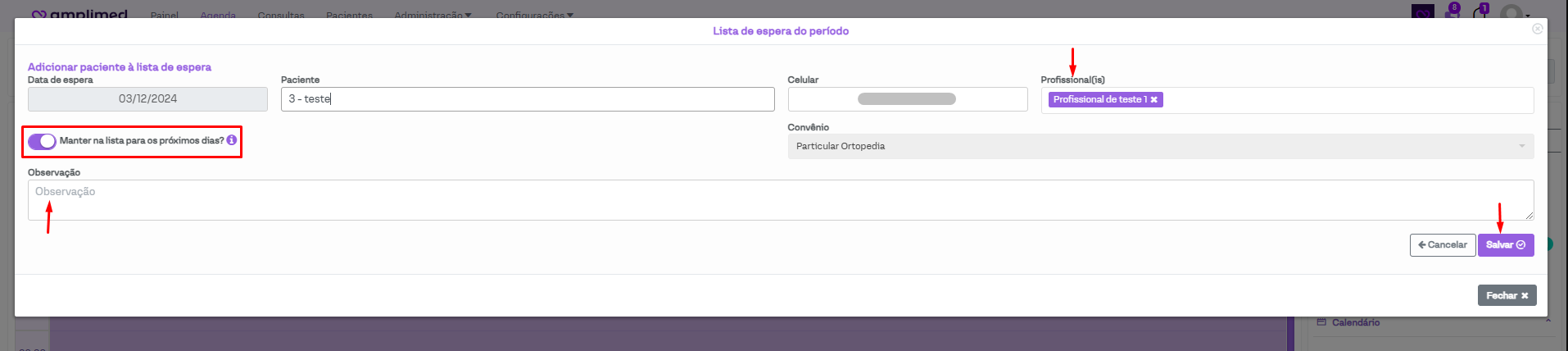 Em seguida, preencha os campos solicitados. E atenção especial para a opção "Manter na lista para os próximos dias?". Caso ela for marcada, o paciente continua sendo exibido na lista nos próximos dias. Já no caso dela estar desmarcada, o agendamento ficará na lista de espera somente durante o dia que foi cadastrado. E por fim, clique em "salvar"