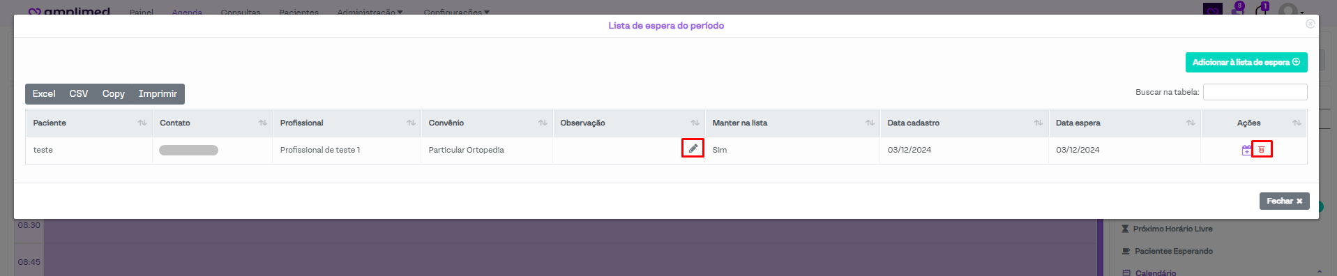 Prontinho! O agendamento irá aparecer na lista de espera. E será possível editar as observações (clicando sobre o ícone do lápis) e excluir ele (clicando no ícone de lixeira em vermelho).