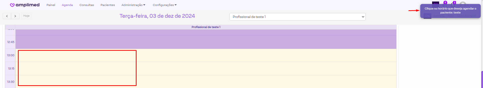 Será preciso clicar sobre o horário desejado que esteja disponível na agenda.