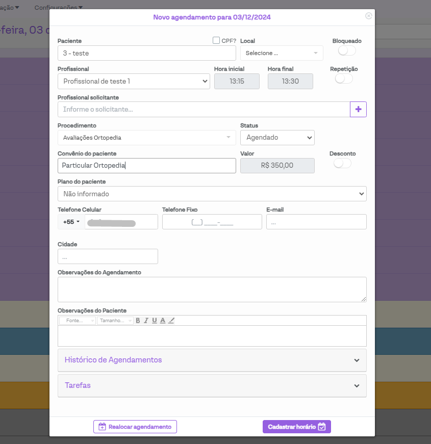 Ao clicar no horário, será aberta a janela de criação do agendamento, já com os dados que haviam sido preenchidos na lista de espera e basta seguir com a criação do agendamento como costume.
