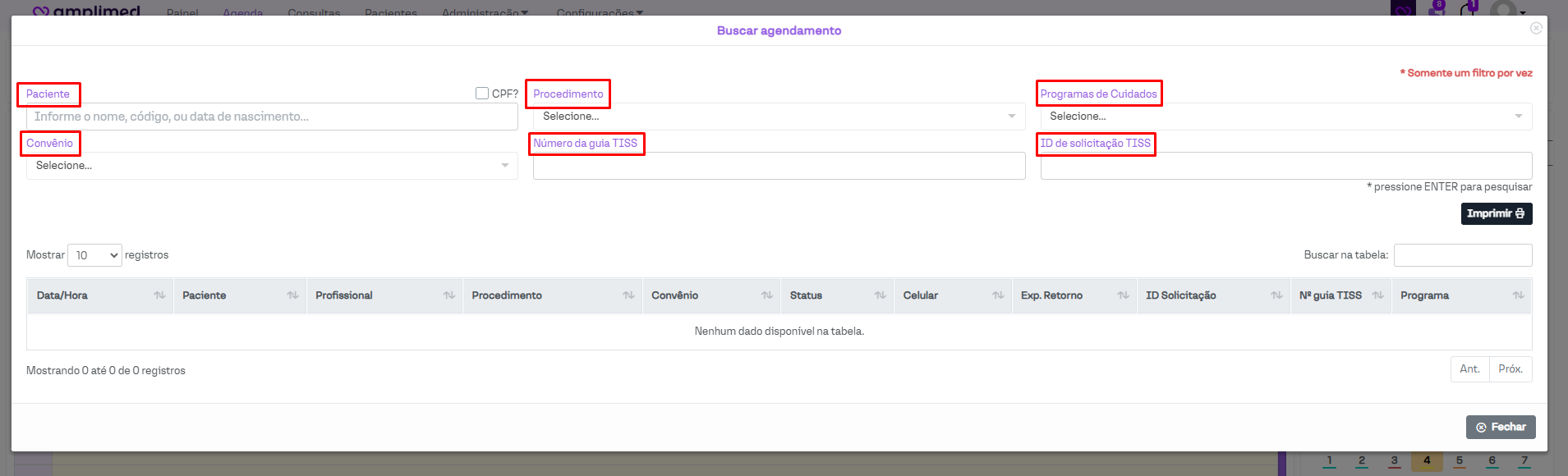 A sua utilização é bem intuitiva e simples. Após clicar nesta função será aberta uma nova janela. Nela serão exibidas as opções de filtros que podem ser utilizados (paciente, procedimento, programas de cuidados, convênio, número da guia TISS e ID de solicitação TISS.