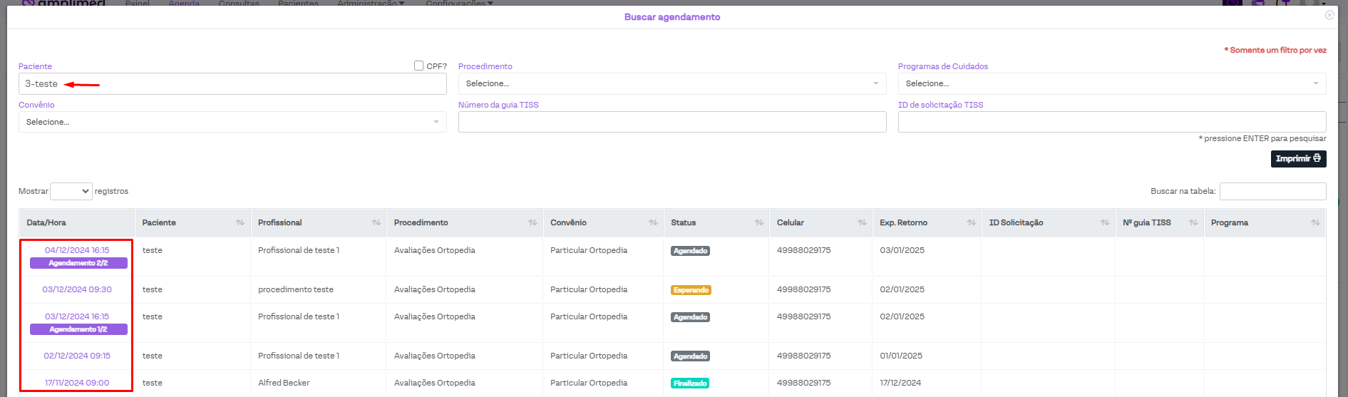 Após inserir a informação no filtro desejado, será exibida uma lista com os agendamentos encontrados a partir dela. Por exemplo, se foi inserido um paciente, será retornado todos os agendamentos encontrados para ele. Para acessar o agendamento desejado, basta clicar sobre a informação de data/hora dele.
