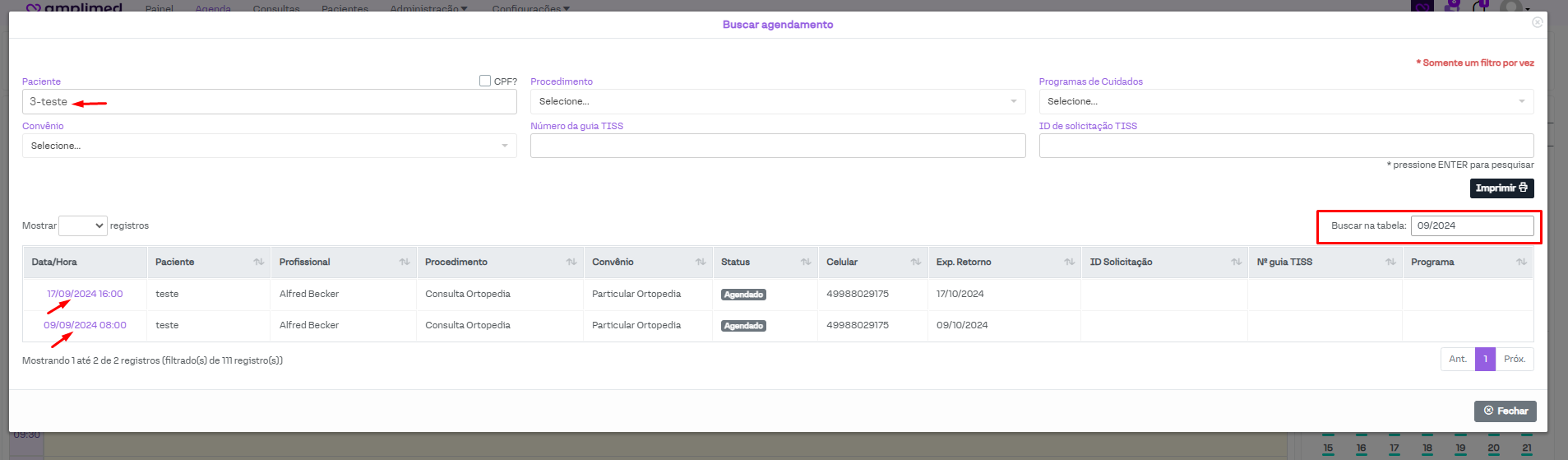 Por exemplo, após filtrar os agendamentos do paciente "3- teste", desejamos filtrar somente os agendamentos realizados no mês de setembro de 2024. Nesse caso, basta inserir essa informação exatamente com os mesmos caracteres que as colunas são apresentadas (sejam letras, números, espaços ou símbolos). Para isso, inserimos no buscar tabela "10/2024" e temos apenas os agendamentos que contenham essa informação em alguma das suas colunas.