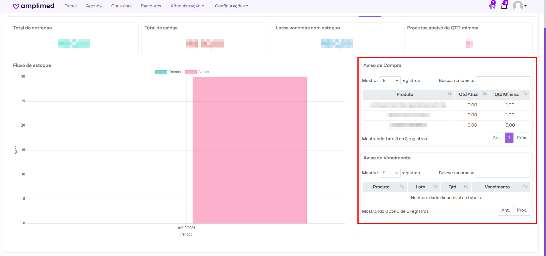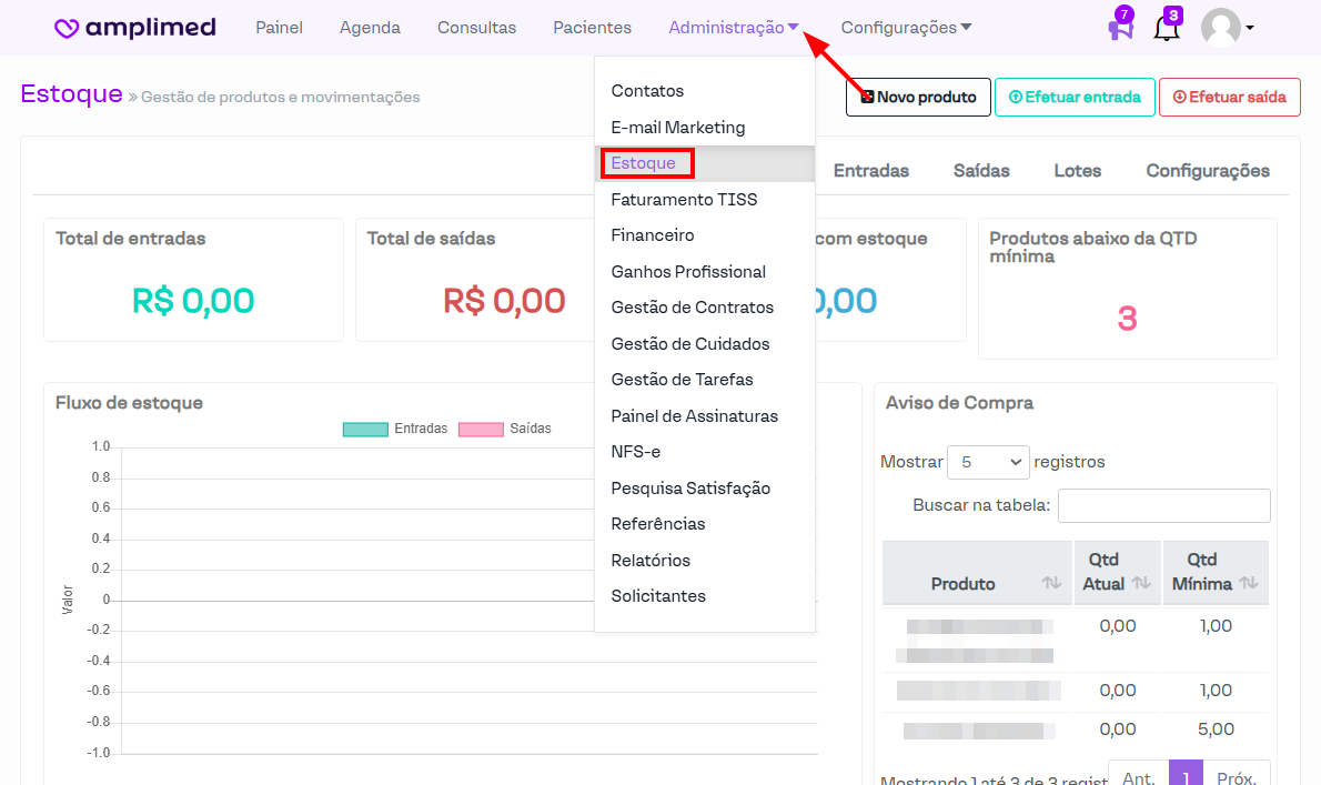 Na lateral direita, há uma seção destinada aos produtos com Aviso de Compra. Isso significa que esses produtos atingiram a quantidade mínima recomendada, sendo necessário realizar a reposição para ajustar o estoque.