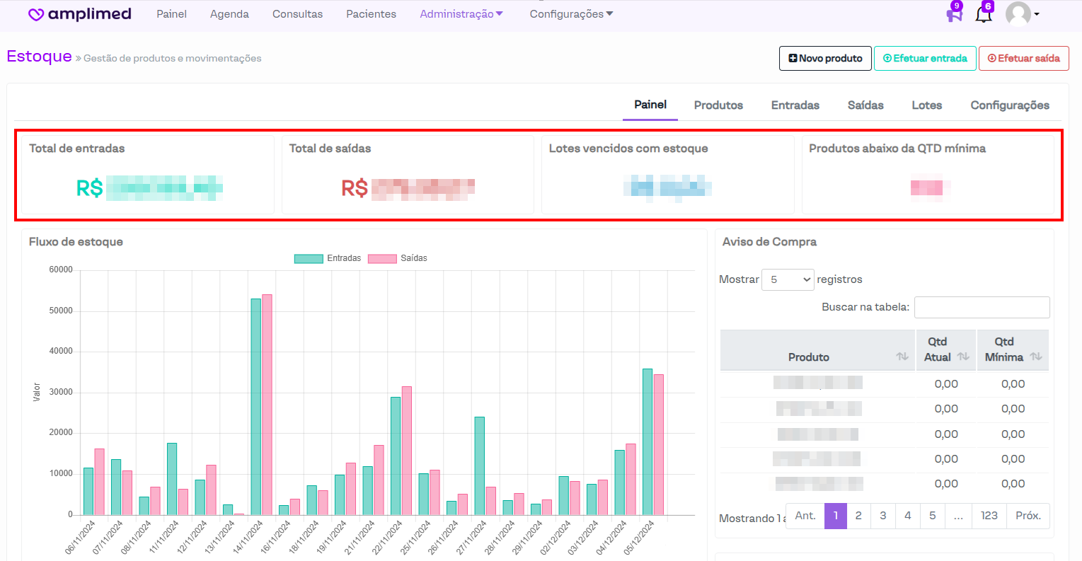 Os valores exibidos nos campos de total de entradas e saídas correspondem às movimentações registradas nos últimos 30 dias no sistema.
