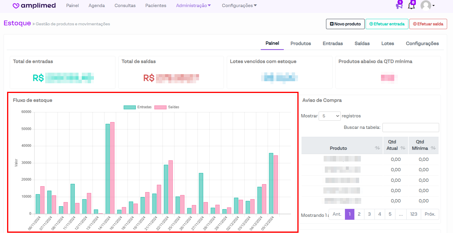 Nesta seção do sistema, é possível gerenciar o estoque, cadastrar produtos e lotes, registrar entradas e saídas de produtos, além de gerar relatórios que auxiliam no controle do estoque.