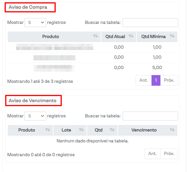 Na parte inferior, há uma seção destinada aos Avisos de Vencimento. Nessa área, são exibidos os produtos que estão dentro do período configurado para o aviso prévio de vencimento.