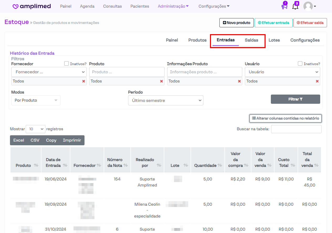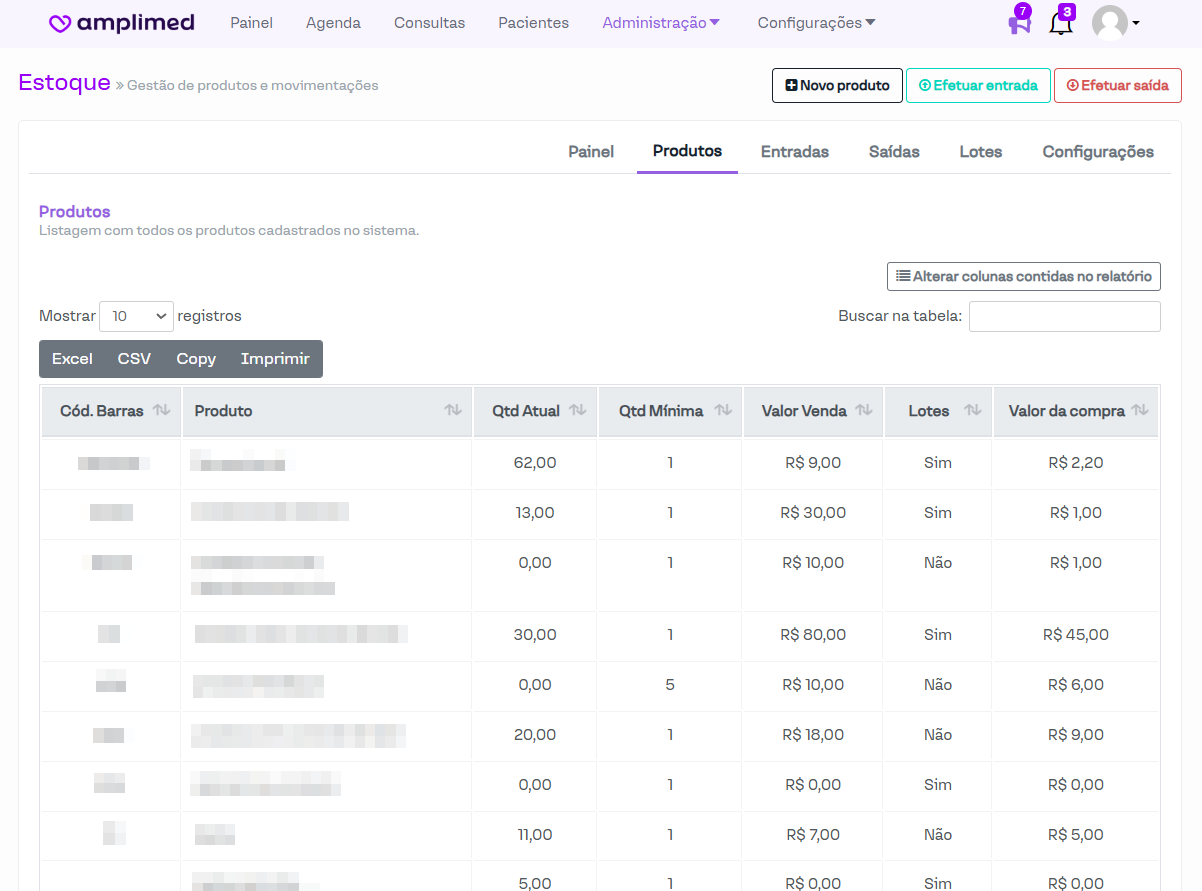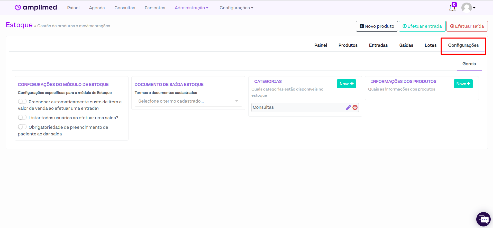 O módulo de estoque está organizado em várias seções: Painel, Produtos, Entradas, Saídas, Lotes e Configurações. Independentemente da seção aberta, os botões Novo produto, Efetuar entrada e Efetuar saída estarão sempre disponíveis, facilitando o acesso a essas funcionalidades.
