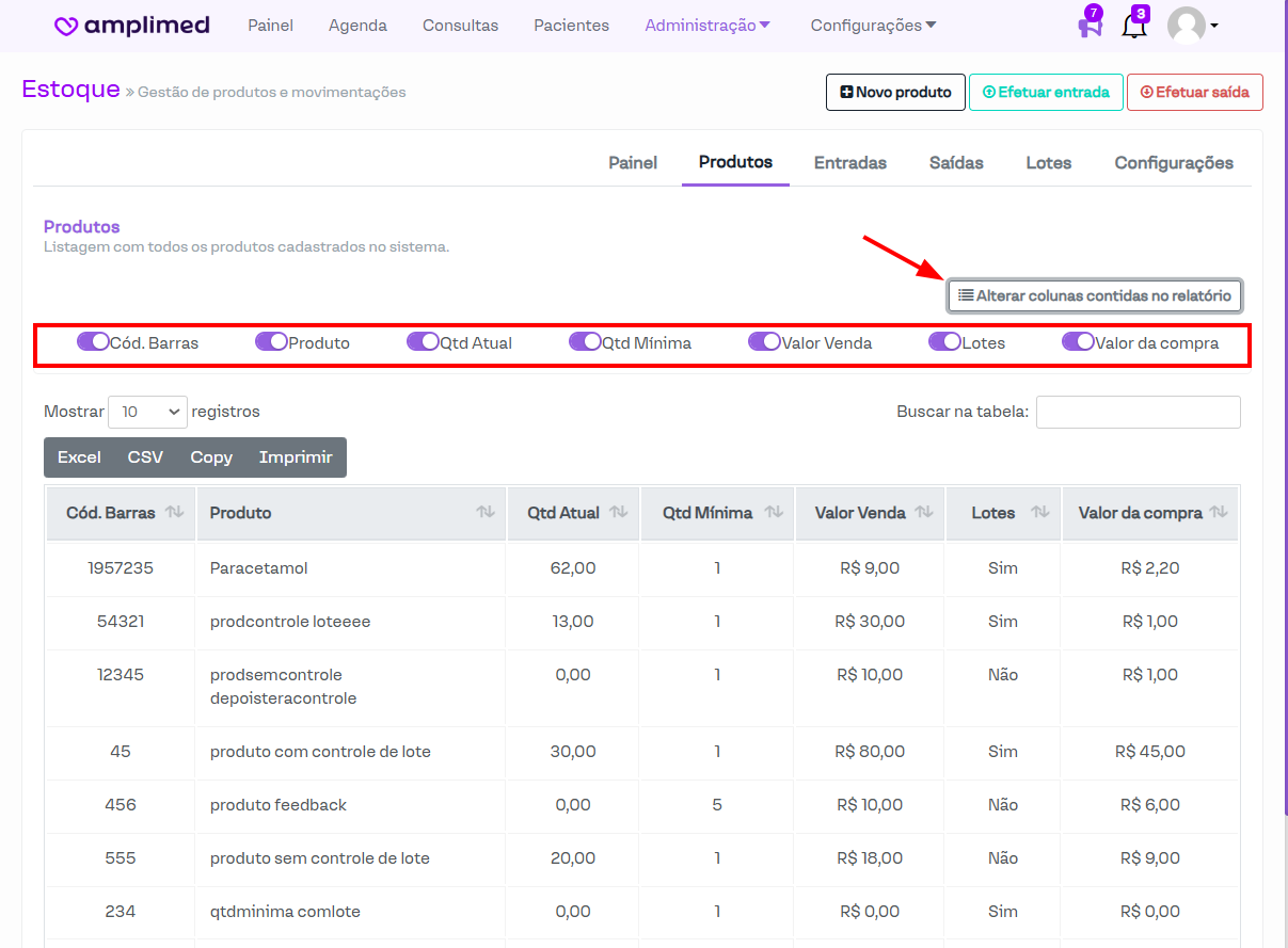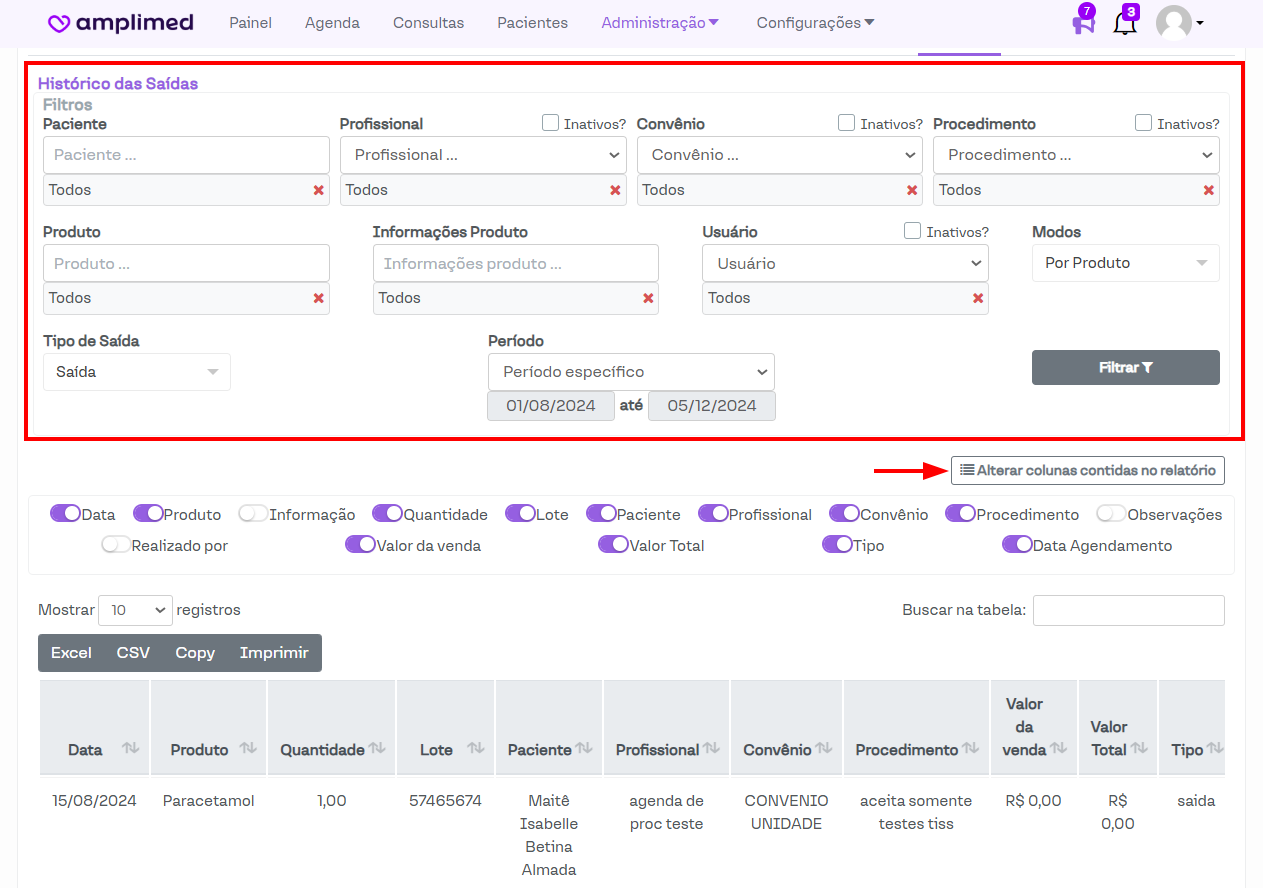 Em ambos relatórios, é possível alterar as colunas contidas no mesmo, conforme destacado na imagem acima.