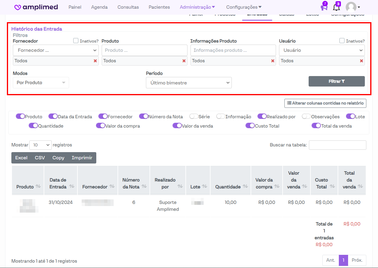 No relatório das entradas é possível gerar relatórios de acordo com os filtros Fornecedor, Produto, Informações do Produto, Usuário, além de permitir a seleção da opção de inativos, Modos de visualização e Período.