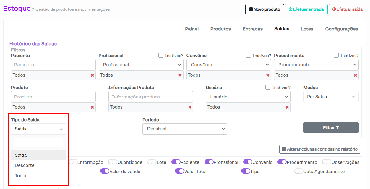O filtro referente ao Tipo de Saída possui as opções "Saída" e "Descarte", distinguindo se foi uma saída de produto regular ou o descarte de produtos vencidos.